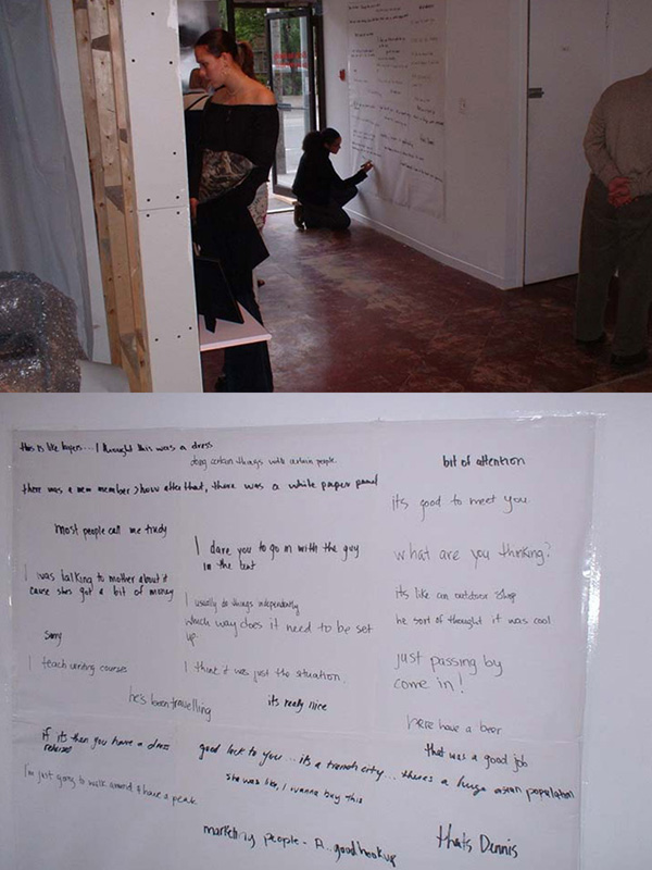 I am interested in communication. In particular, I am interested in the changes it undergoes when processed through various filters. I would like to explore this by appropriating the dialogue of others. I will casually walk around the gallery space listening to the conversations that people in the gallery are engaged in. When I am able to capture a fragment of conversation, I will write with a marker what I have heard, using the wall as a writing surface. This process of recording the conversation of others will occur for approximately 30 minutes (depending on the activity within the gallery). In doing so, the audience becomes a participant without being aware. I will then begin to arrange the fragments of conversation into my own narrative. When this is complete, I will recite what I have written. I now will be engaging in a dialogue with those in the gallery. The objective and final outcome of this performance will be me communicating with others, a story through the use of their words. This brings into question not only the authenticity of my reconstructed narrative, but also the narratives of the original speaker(s). Due to the process of appropriating dialogue, there is a sense of displacement of narrative from the original speaker and the original context in which it was said and heard. This displacement is further emphasized when it is acknowledged that the chosen dialogue is manipulated to suit the needs of another speaker. Although this occurs, the final outcome formulates a connectedness amongst the fragmented dialogue, to create a narrative that speaks of process, ownership, and space. |