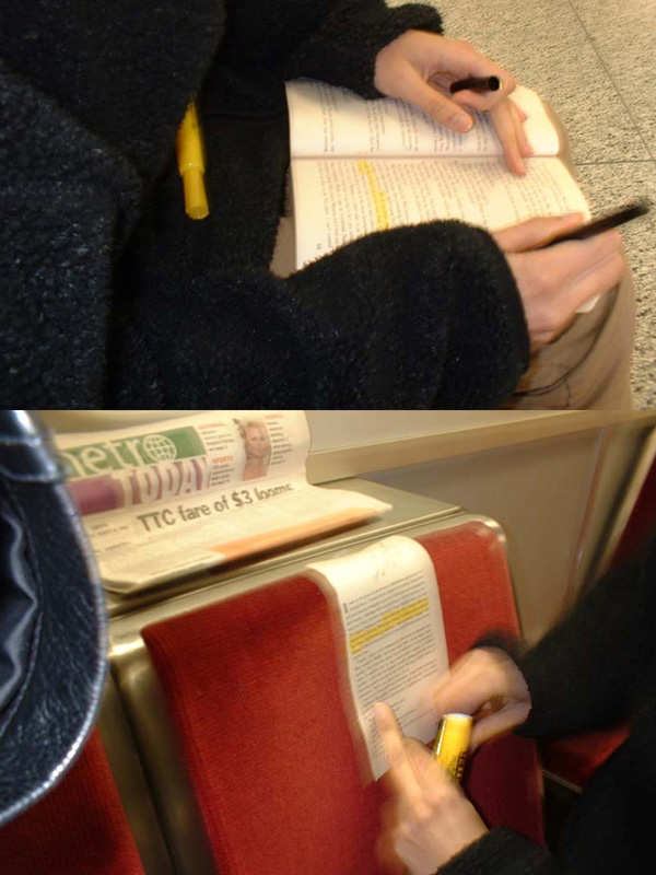 For this intervention, I read White Noise by Don DeLillo during my daily travels on Toronto public transportation. This novel was chosen due to the pacing of the text and its similarity to the pace of my journey. Furthermore, the themes embedded in this novel held a significant relationship to the act of reading on public transportation as a daily ritual, and more importantly to the space of public transportation as a site of vulnerability in relation to what we are given to read (free newspapers, advertisements, etc…) and to other commuters, which stems from the aftermath of 9-11 in New York City.