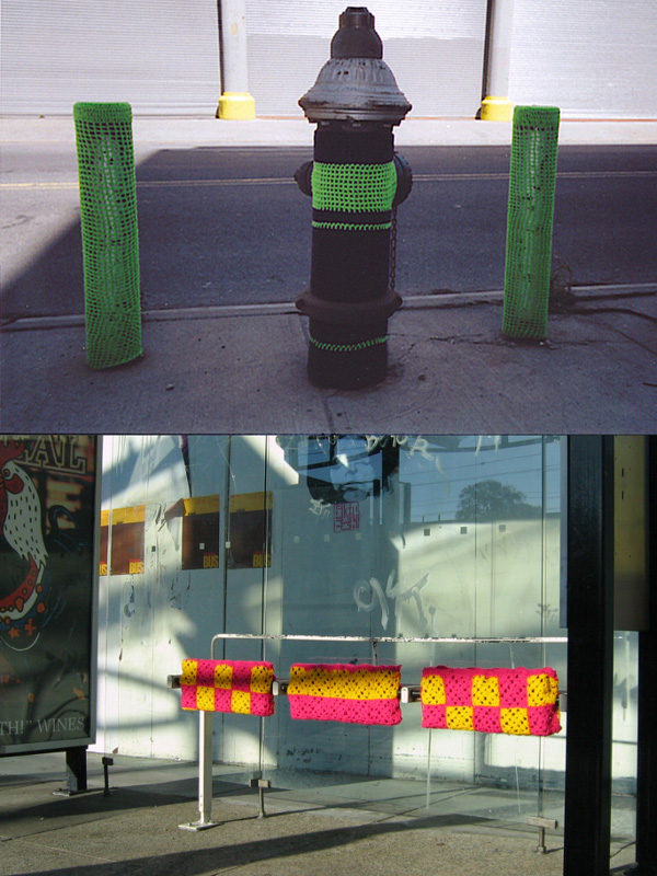 “…to think imaginatively about space, about the link between what we desire, dream about, and what is practical.” bell hooks Sitting in my mother’s living room one night, I looked around at the objects that occupied the space. I noticed that there lacked decorative embellishments. The decorative elements are essentially minimal except for the crocheted mats, tablecloths, and blankets. These hand made objects are projects made by the women in my family for over four generations. These items make the home feel warm and complete. I spent some time looking at these objects and realized that I never really appreciated the role they played in making my mother’s house a home of comfort and familiarity. With this in mind, I also realized that I rarely spent time at home and that most of my time was spent travelling via public transportation or by foot throughout Toronto. It was with this understanding that I became interested in shaping and constructing environments through small interventions by transferring this decorative aspect of my home to the street. I wanted to give ‘cold’, random objects a sense of warmth, aesthetic purpose, and in an odd way, give the street a sense of homeliness. By transferring this family tradition of crocheting from my house to objects on the street, I am taking something out of its normal environment and placing it in an unfamiliar surrounding. This makes the space a place of familiarity. Perhaps those who come into contact with the objects will consider steps that they could take to beautify the city, to make it a place of comfort and familiarity instead of a place of cold concrete and ambiguity. (Untitled) Book Piece