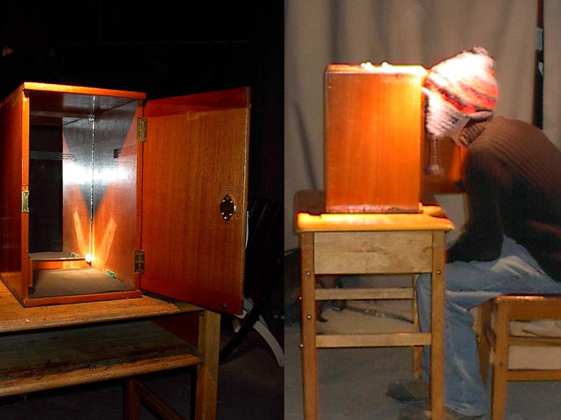 There are no instructions given with the key. Each key opens the door to a wooden box that sits on a desk in the corner of the gallery. The front of the box reads: