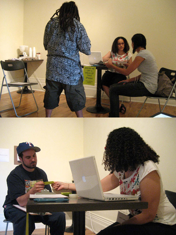 Sitting at a desk, I type fragments of narrative relating to an experience of ‘passing’ onto a pre-made passport for a particular country of ‘passing’. Using a projector, a person in the gallery is asked to project the map of that particular country onto my face. I trace that map on my face. I draw on the wall behind me a copy of that map from memory. I photograph myself. I ask a viewer to sign the passport verifying my identity. This is a crucial aspect as the individual may or may not choose to sign the passport, therefore choosing to affirm or negate my identity. The passport and photograph is hammered into the wall. I wipe the map off my face, leaving remnants of the drawing. I repeat this activity until all stories of ‘passing’ are typed and the corresponding passports are created. To conclude, using my face, I wipe away the hand drawn map on the wall. The passports, photographs, and smeared map remain as artifacts of this process of claiming and being claimed. 2005Break Me Off a Piece of That (Please)