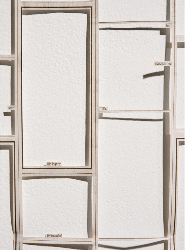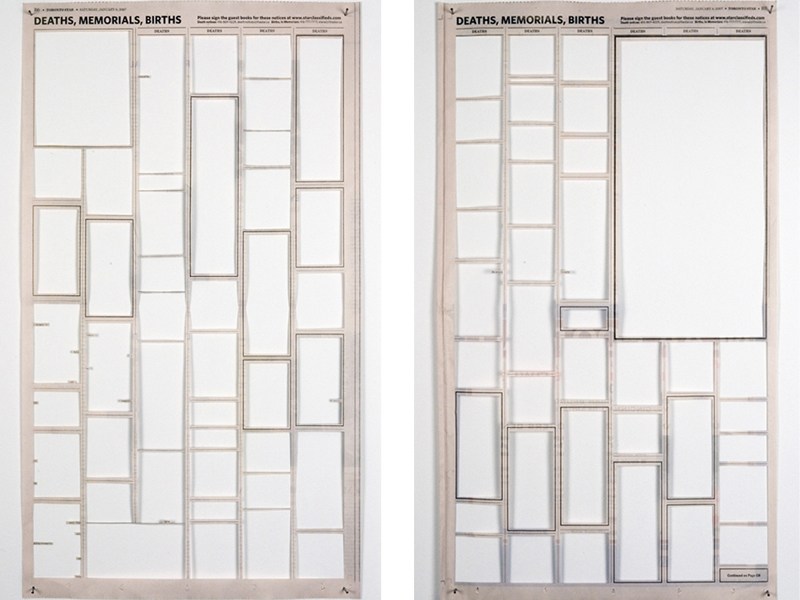 I started collecting the ‘Obituary’ section from the Toronto Star, as they were read by me in November 2006. Reading over the death notices, I began formulating memories. Many of these memories are fabricated - they become constructions of what I imagine past relationships were like, how they are in the present, and how they would be in the future. I kept track of words that resonated with me on each day, by writing them down and nothing what column and row they were located on. Once I completed this process for each day, I would work with those words to create a metaphorical narrative that was representative of the memory that had been created. I cut out all of the death notices - leaving the borders that framed them and the lines that separated them then I took those words that were selected and removed and placed them within the space where they were originally found. The final product of this act is then digitally photographed as a means of questioning authorship, the extent of absence, and the limits of time.