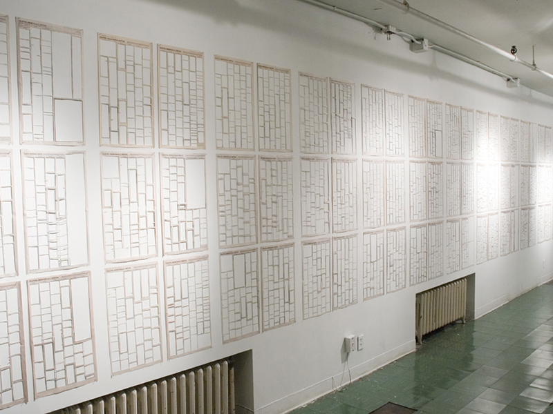 Deaths, Memorials, Births is an ongoing, ever growing work. It will continue for as long as I have the ability to remember the past and imagine the future. When installed, the individual pieces that comprise this work take the form of a memorializing structure, both through the actual objects created and the shadows projected on the wall by the sheets themselves. The shadows create a three dimensional component to the work, but also re-enunciates the pace at which the absence grows and spreads from day to day, and month to month. In a sense, the shadows compensate for loss by giving a presence to empty, negative spaces. In a temporary way, they concretize and cast a body that is lost, missing, but never forgotten and never quite remembered. As a body of work displayed on a wall, they create a monumental gesture of grief and of loss. At this point in its creation, this monument functions as a form of remembrance, grief, preservation, tension and trauma.
